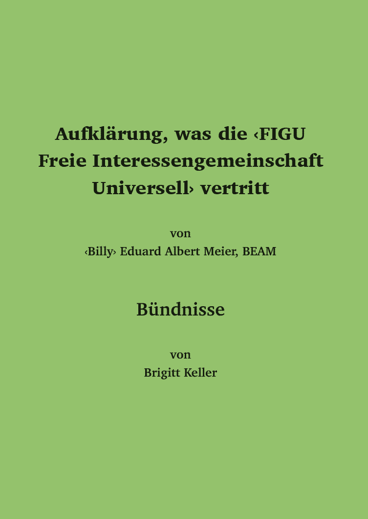 Der Verein ‹FIGU Freie Interessengemeinschaft Universell› ist keinem weltlichen oder religiösen Glauben angehörend und mit seiner ‹Lehre der Wahrheit, Lehre der Schöpfungsenergie, Lehre des Lebens› darauf ausgerichtet, dem Menschen der Erde – wenn er aus freiem Willen und ureigener Entscheidung sich der Lehre zuwenden will – zu helfen, sie zu erlernen und zu befolgen. Dies ohne Indoktrination, irgendwelche Beeinflussung, Überredung und ohne irgendwelchen Zwang, die Wahrheit zu erlernen und wahrlich sich selbst zu sein…