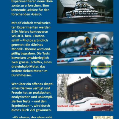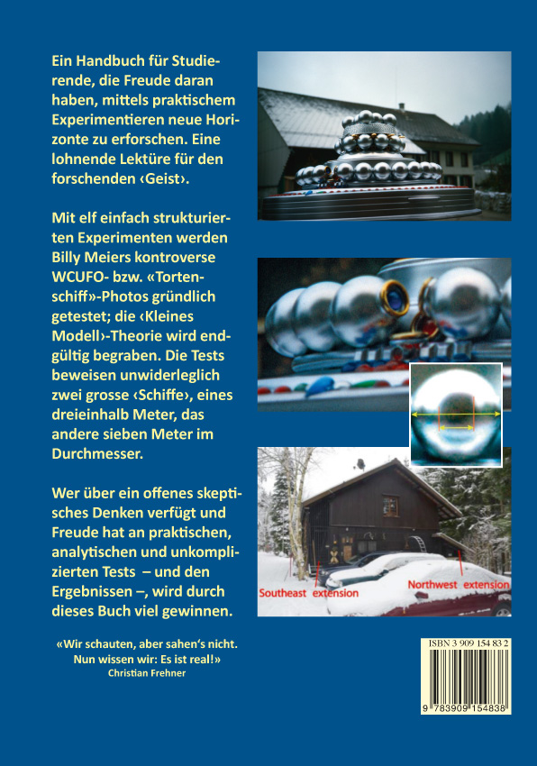 Mit elf einfach strukturierten Experimenten werden Billy Meiers kontroverse WCUFO-bzw. «Tortenschiff»-Photos gründlich getestet; die ‹Kleines Modell›-Theorie wird endgültig begraben. Die Tests beweisen unwiderleglich zwei grosse ‹Schiffe›, eines dreieinhalb Meter, das andere sieben Meter im Durchmesser.