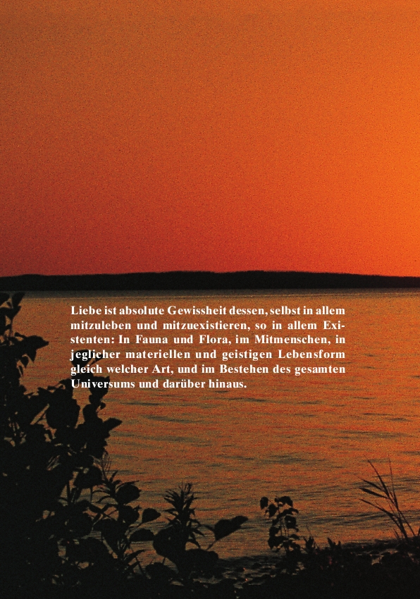 “Liebe ist die absolute Gewissheit dessen, selbst in allem mitzuleben und mitzuexistieren, so in allem Existen: In Flora und Fauna, im Mitmenschen, in jeglicher materiellen und geistigen Lebensform gleich welcher Art, und im Bestehen des gesamten Universums und darüber hinaus.”