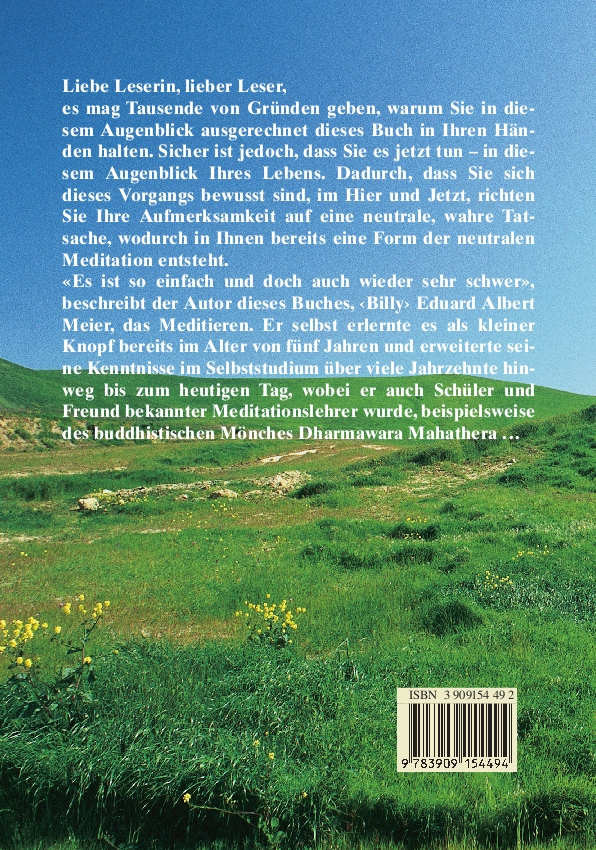 “Liebe Leserin, lieber Leser, es mag Tausende von Gründen geben, warum Sie in diesem Augenblick ausgerechnet dieses Buch in Ihren Händen halten. Sicher ist jedoch , dass Sie es jetzt tun – in diesem Augenblick Ihres Lebens. Dadurch, dass Sie sich dieses Vorgangs bewusst sind, im Hier und Jetzt, richten Sie Ihre Aufmerksamkeit auf eine neutrale, wahre Tatsache, wodurch in Ihnen bereits eine Form der neutralen Meditation entsteht. «Es ist so einfach und doch auch wieder sehr schwer», beschreibt der Autor dieses Buches, ‹Billy› Eduard Albert Meier, das Meditieren. Er selbst erlernte es als kleiner Knopf bereits im Alter von fünf Jahren und erweiterte seine Kenntnisse im Selbststudium über viele Jahrzehnte hinweg bis zum heutigen Tag, wobei er auch Schüler und Freund bekannter Meditationslehrer wurde, beispielsweise des buddhistischen Mönches Dharmawara Mahathera …”