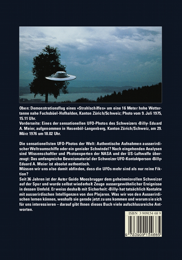 Die sensationellsten UFO-Fotos der Welt: Authentische Aufnahmen ausserirdischer Weltraumschiffe oder ein genialer Schwindel? Nach eingehenden Analysen sind Wissenschaftler und Fotoexperten der NASA und der US-Luftwaffe überzeugt: Das umfangreiche Beweismaterial der Schweizer UFO-Kontaktperson Eduard “Billy” Meier ist absolut authentisch. Müssen wir uns also damit abfinden, dass die UFOs mehr sind als nur reine Fiktion? Seit 15 Jahren ist der Autor Guido Moosbrugger dem geheimnsvollen Schweizer auf der Spur, wurde selbst wiederholt Zeuge aussergewöhnlicher Ereignisse in dessen Umfeld. Heute ist er überzeugt: “Billy” hat tatsächlich Kontakte mit ausserirdischen Intelligenzen von den Plejaden. Was die Ausserirdischen uns lehrten, weshalb sie gerade jetzt zu uns kommen, warum sie ich für uns interessieren – nach der Lektüre des Buches wird für Sie hinter dem grössten Rätsel dieses Jahrhunderts kein Fragezeichen mehr stehen.