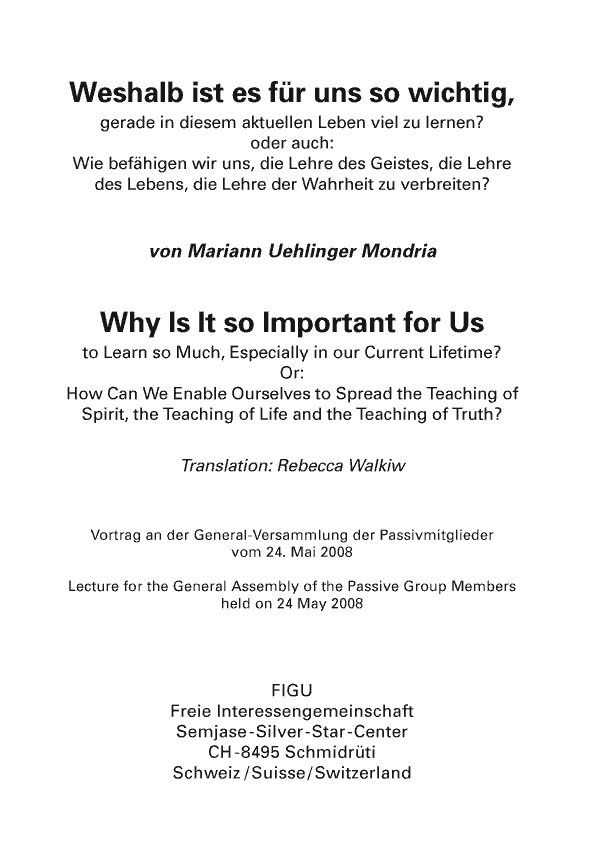 Auszug: “Sowohl als Mitglied der KG der 49 wie als Passivmitglied sind wir und alle, die nach uns kommen, dafür zuständig und verantwortlich, die FIGU und ihre Mission auch nach dem dereinstigen Ableben Billys weiterzuführen, damit in ferner Zukunft weltweit Frieden, wahre Liebe, Freiheit und Harmonie unter der irdischen Menschheit werde. Aber – Hand aufs Herz –, wie können wir die Mission überhaupt und auch ohne Gesichtsverlust weiterführen, wenn wir alle selbst viel zu wenig wissen; wenn das, was wir jetzt studieren, noch gar nicht richtig uns gehört, also bei uns noch nicht in Fleisch und Blut übergegangenist, da das nötige Wissen und die Erfahrung fehlen?”